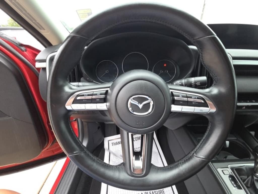 4-Wheel Disc Brakes, 8 Speakers, ABS brakes, Air Conditioning, Alloy wheels, AM/FM radio, AppLink/Apple CarPlay and Android Auto, Auto High-beam Headlights, Automatic temperature control, Brake assist, Bumpers: body-color, Delay-off headlights, Driver door bin, Driver vanity mirror, Dual front impact airbags, Dual front side impact airbags, Electronic Stability Control, Emergency communication system: MAZDA CONNECT, Exterior Parking Camera Rear, Front anti-roll bar, Front Bucket Seats, Front Center Armrest, Front dual zone A/C, Front reading lights, Front wheel independent suspension, Fully automatic headlights, Half Leatherette Seat Trim, Heated door mirrors, Heated Front Bucket Seats, Heated front seats, Illuminated entry, Knee airbag, Leather Shift Knob, Leather steering wheel, Low tire pressure warning, Occupant sensing airbag, Outside temperature display, Overhead airbag, Overhead console, Panic alarm, Passenger door bin, Passenger vanity mirror, Power door mirrors, Power driver seat, Power Liftgate, Power steering, Power windows, Radio data system, Radio: AM/FM/HD Audio System, Rain sensing wipers, Rear seat center armrest, Rear window defroster, Rear window wiper, Remote keyless entry, Soul Red Crystal Metallic Paint Charge, Speed control, Speed-sensing steering, Split folding rear seat, Spoiler, Steering wheel mounted audio controls, Tachometer, Telescoping steering wheel, Tilt steering wheel, Traction control, Trip computer, Turn signal indicator mirrors, Variably intermittent wipers, and Wheels: 17" x 7J Aluminum Alloy.